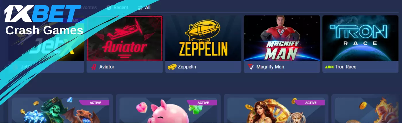 The most popular games are 1xBet Aviator (possible multiplier of 1000x), JetX, and Spaceman.
