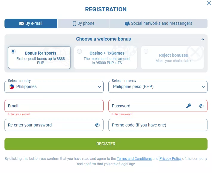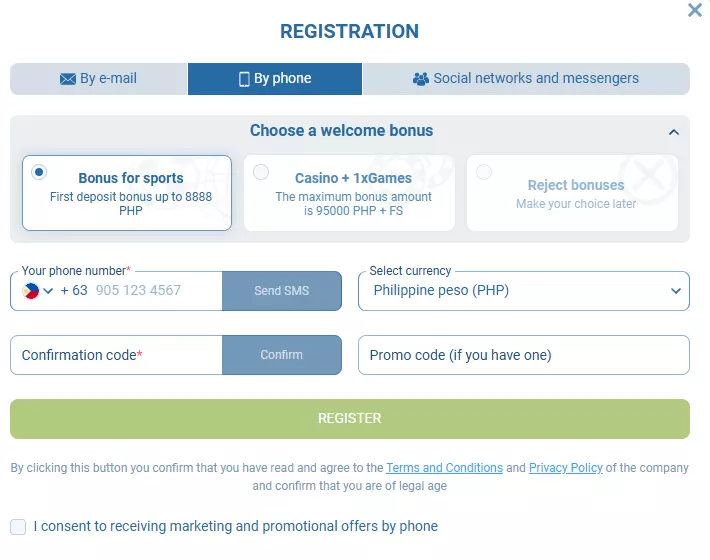 - One-click registration: Fastest method (under 20 seconds). However, it is not always available on the official 1xBet website in the Philippines.