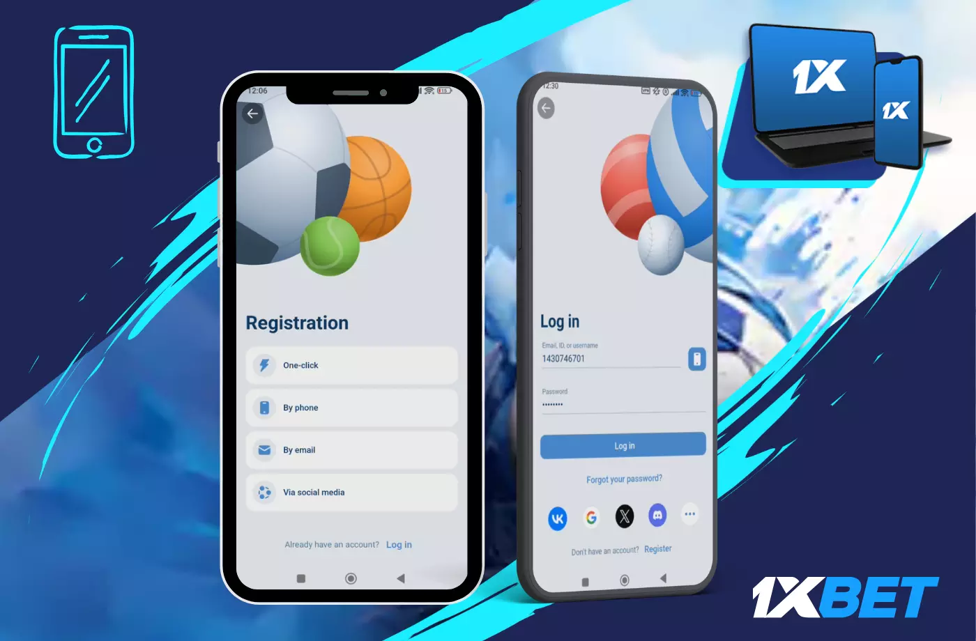 1xBet supports registration through the following platforms: